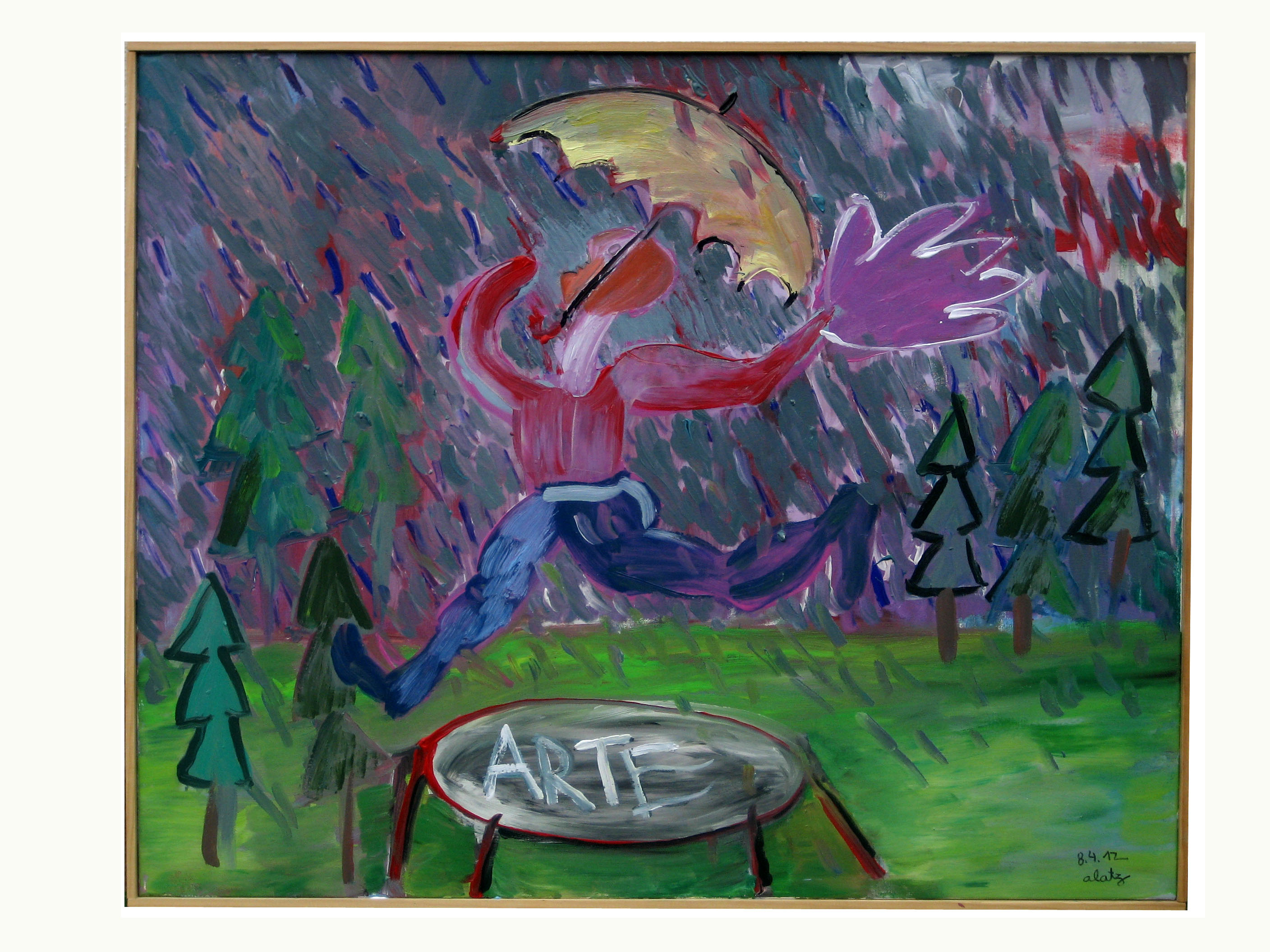 «SALTAR CON EL ARTE A PESAR DE LA LLUVIA». ceras y acrílicos sobre lienzo. 100 X 81 cms.