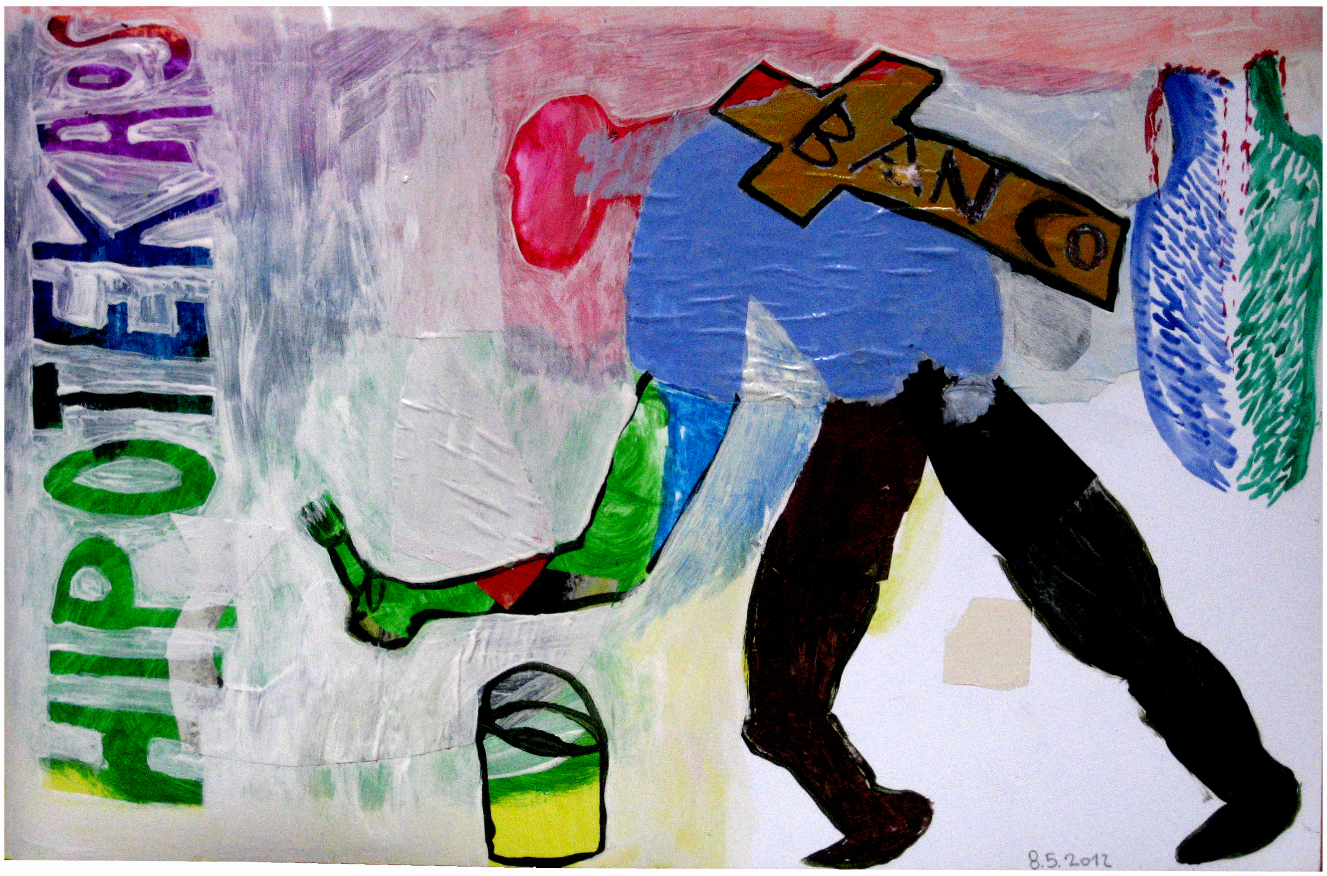 «HIPOTEKAOS. 8.5.2012». ceras, acuarelas, collage y acrílicos sobre papel-cartón. 47 X 30 cms.