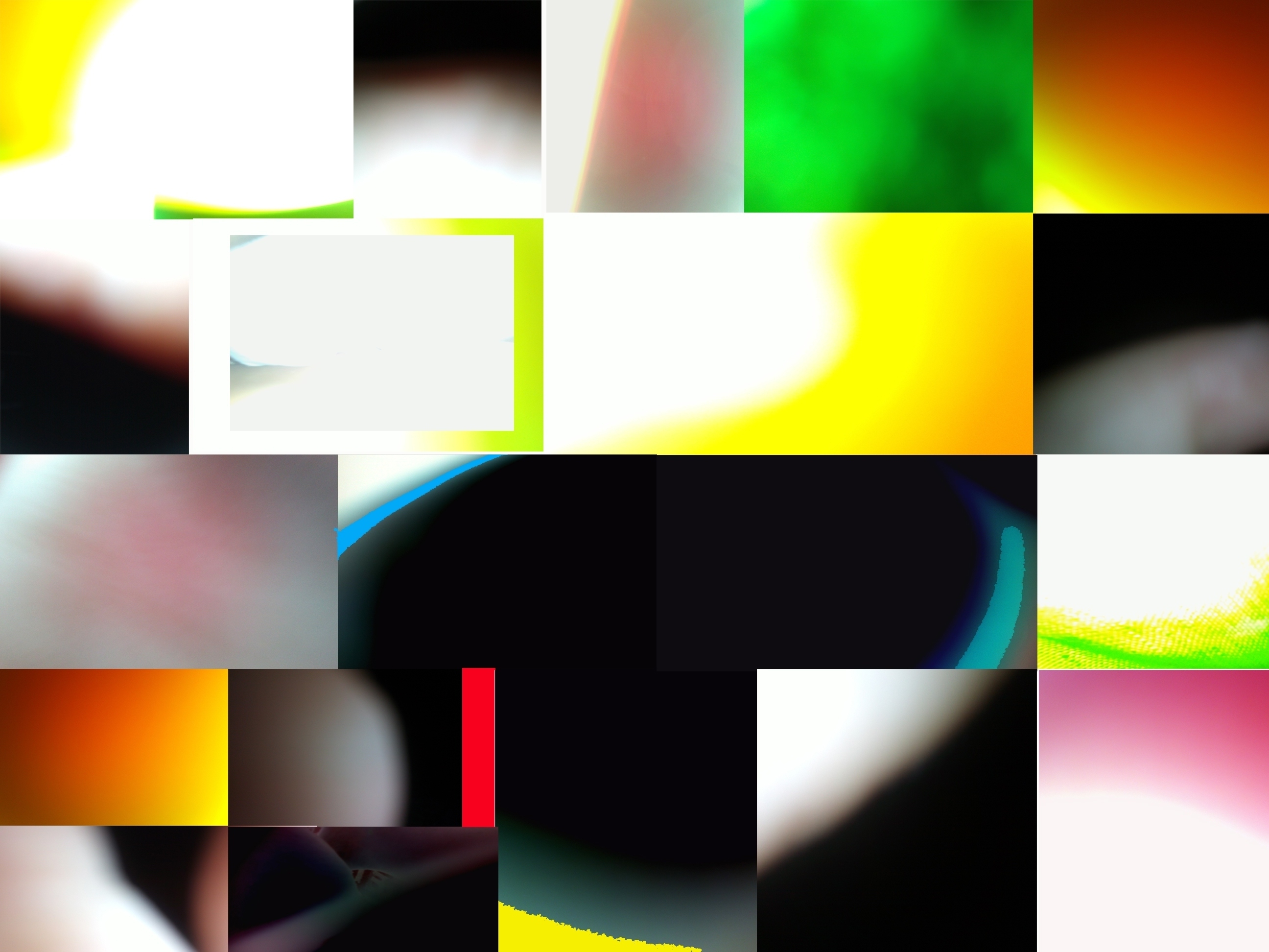 Las he compuesto al azar, algunas de ellas las he «invertido»; una la he colocado encima de la otra enfatizando un cuadrado de bordes verdes (segunda fila de imagenes) y para contrarrestar esa figura, he añadido la franja roja vertical que se puede observar más abajo. También he acentuado los colores azules sobre fondo negro del centro de la imagen y el color amarillo de la fila inferior. Todo con Adobe Photoshop.