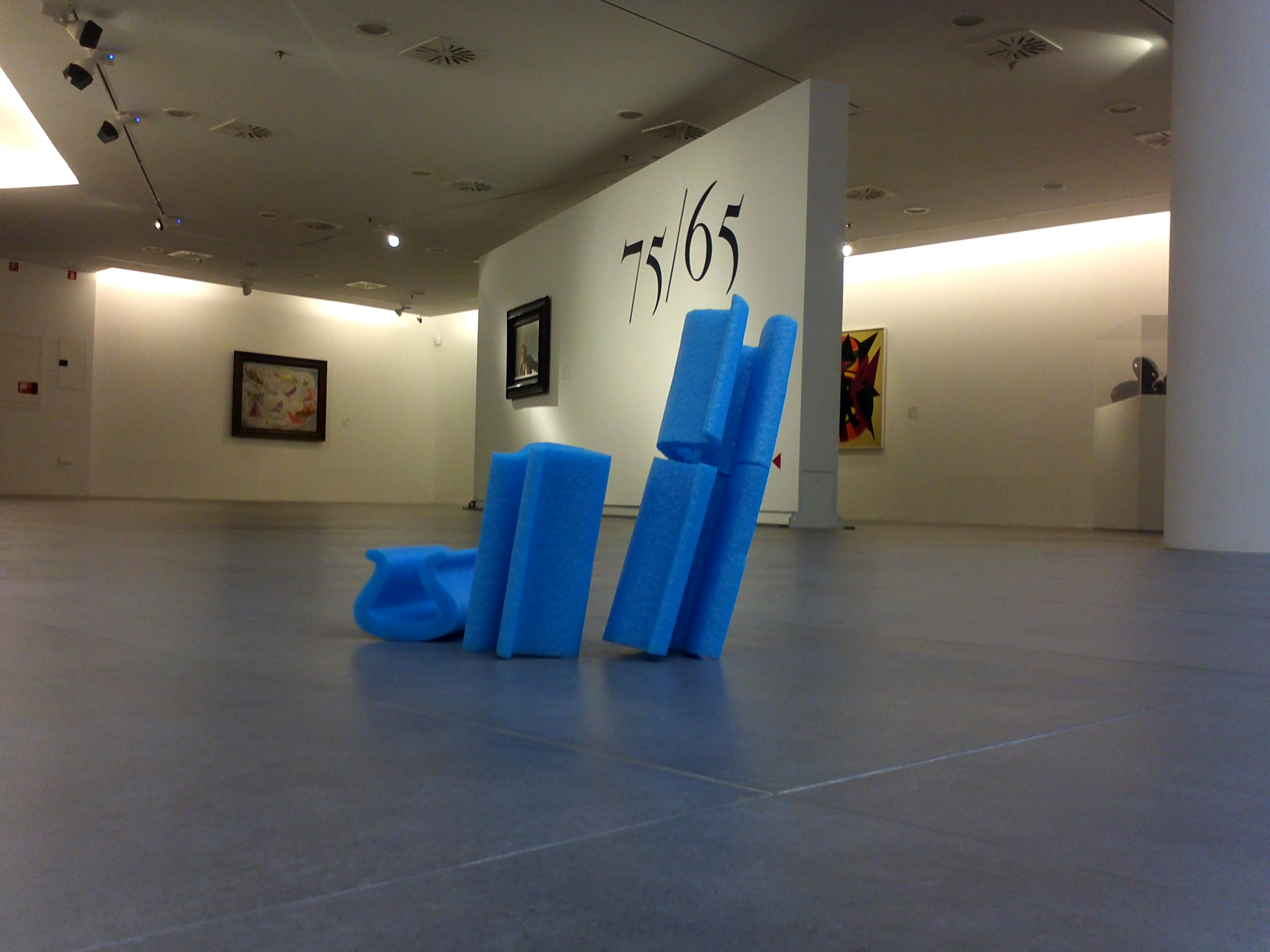 Antes de este dialogo, mientras paseaba por las salas de la exposición, me encontré tirada en el suelo inmaculado una pieza azul de poliuretano que utilizan para proteger los cuadros. No dudé en tomarla una foto. Poco después, junto a ella, se encontraban tres piezas más del mismo material. Y construí la escultura efímera que podéis ver en la imagen. Únicamente me faltó colocar un pequeño cartelito junto a la obra indicando el nombre del artista y la técnica utilizada…para que pase a formar parte de esta colección privada junto a los grandes artistas del siglo pasado… y del presente.