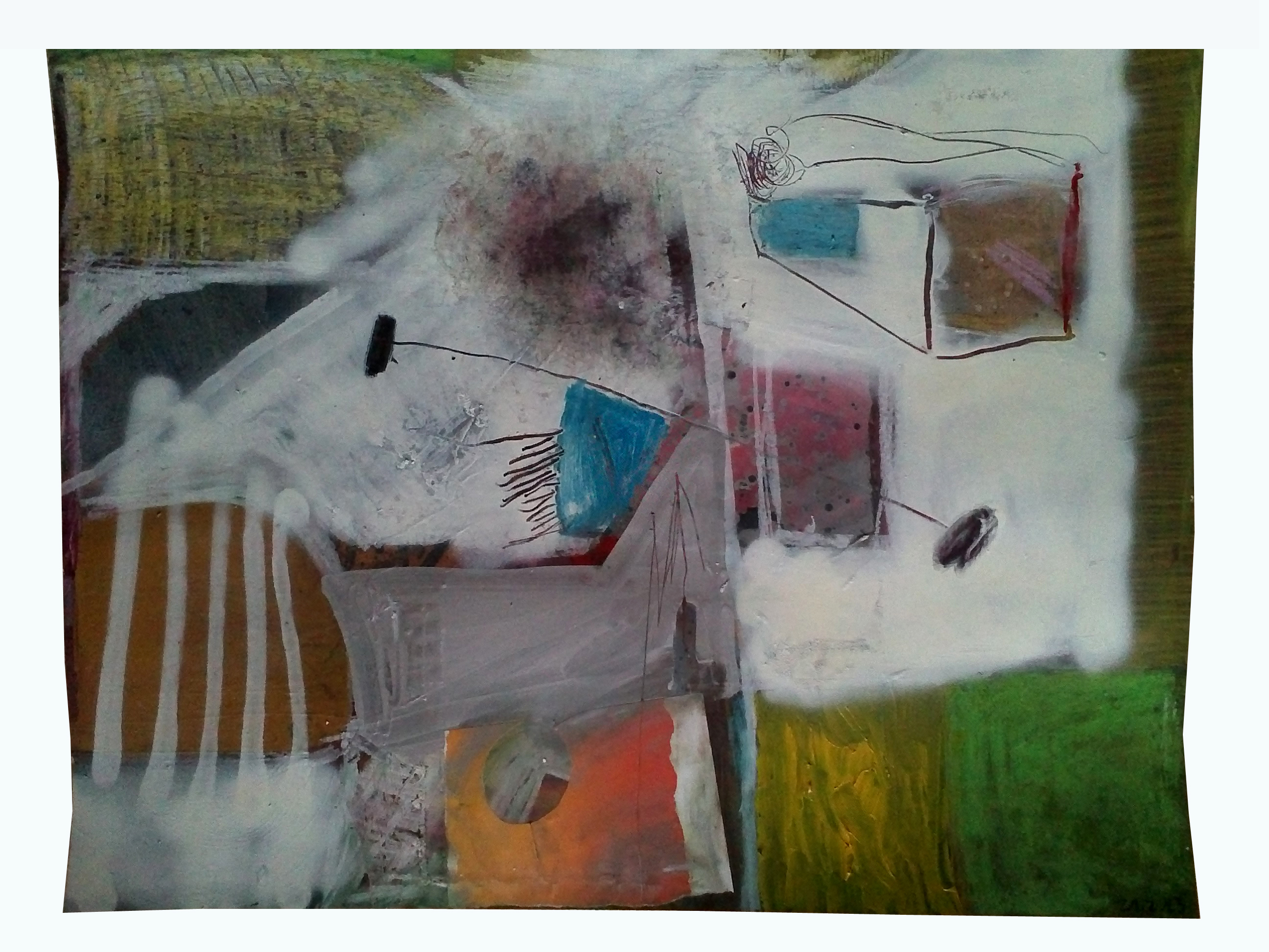 «GARABATOS – HOMBRE EQUILIBRISTA. 21-22.2.13». spray, collage, ceras, acuarelas, barniz, esmalte plateado, óleo y acrílicos sobre cartulina. 50 X 65 cms.