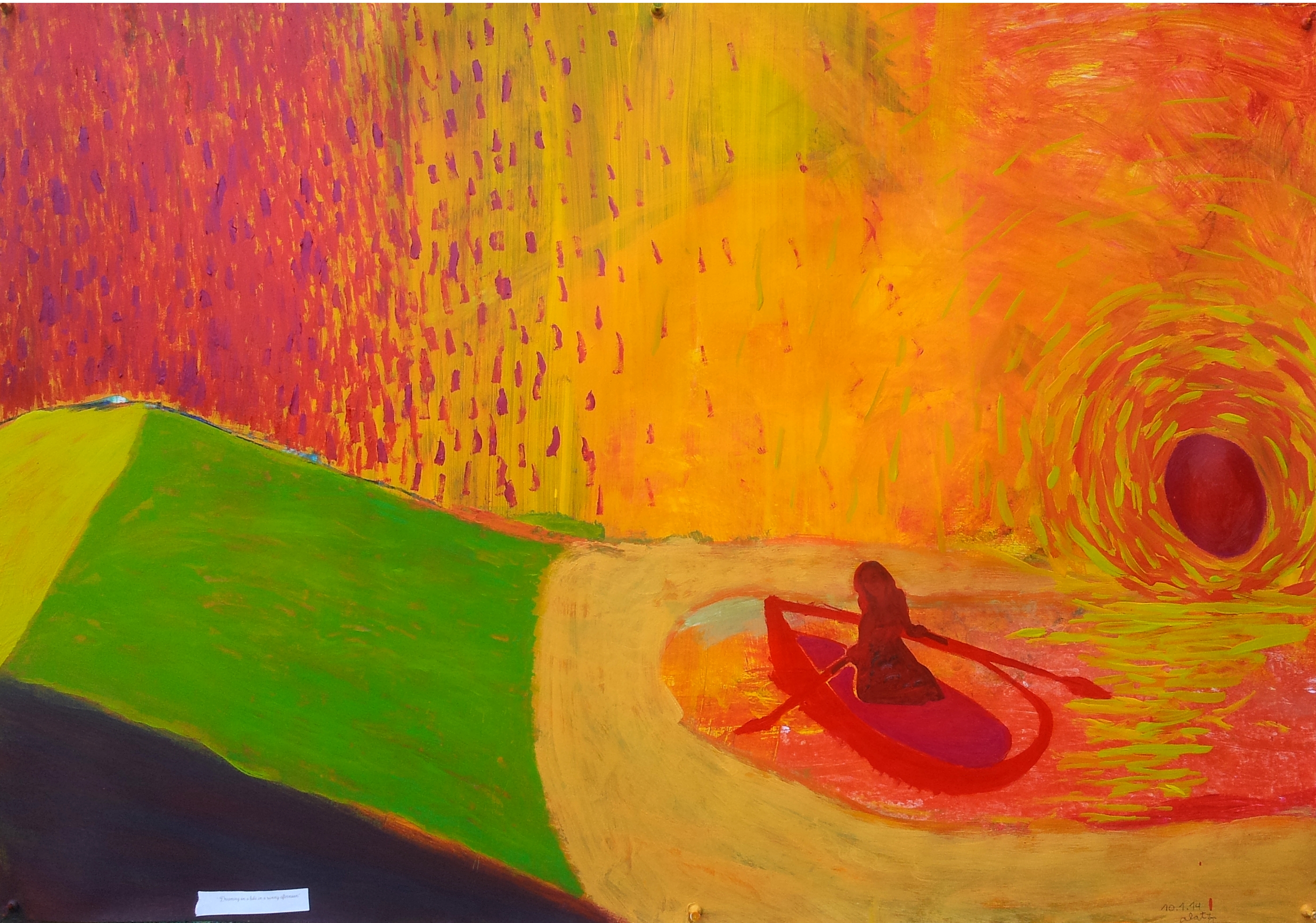 «DREAMING ON A LAKE IN A SUNNY AFTERNOON». acrílicos, collage, ceras y óleo sobre papel. 100 X 70 cms. 10-01-2014.