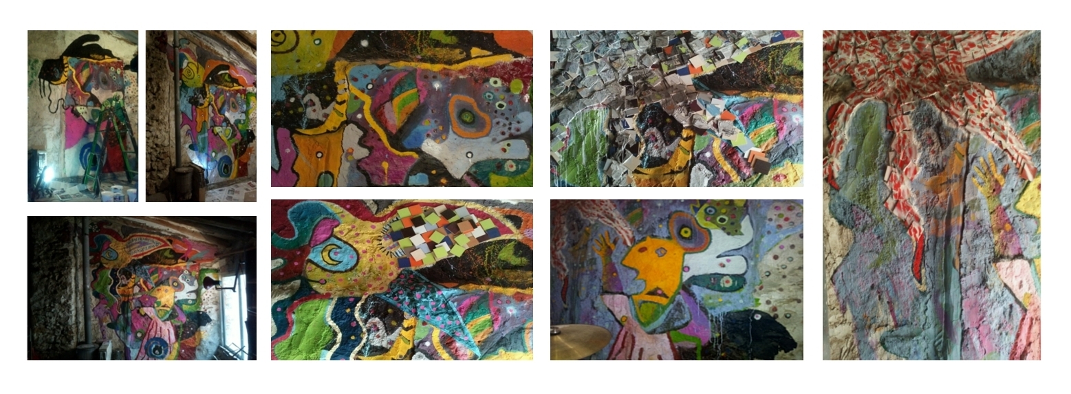 «QUIMERA». acrílicos, maderas , spray y papel de periódico sobre muro de piedra. mural realizado en el Estudio-Taller de Tio Rod (la Rodriguera), Murieta-Navarra. 2013-14.