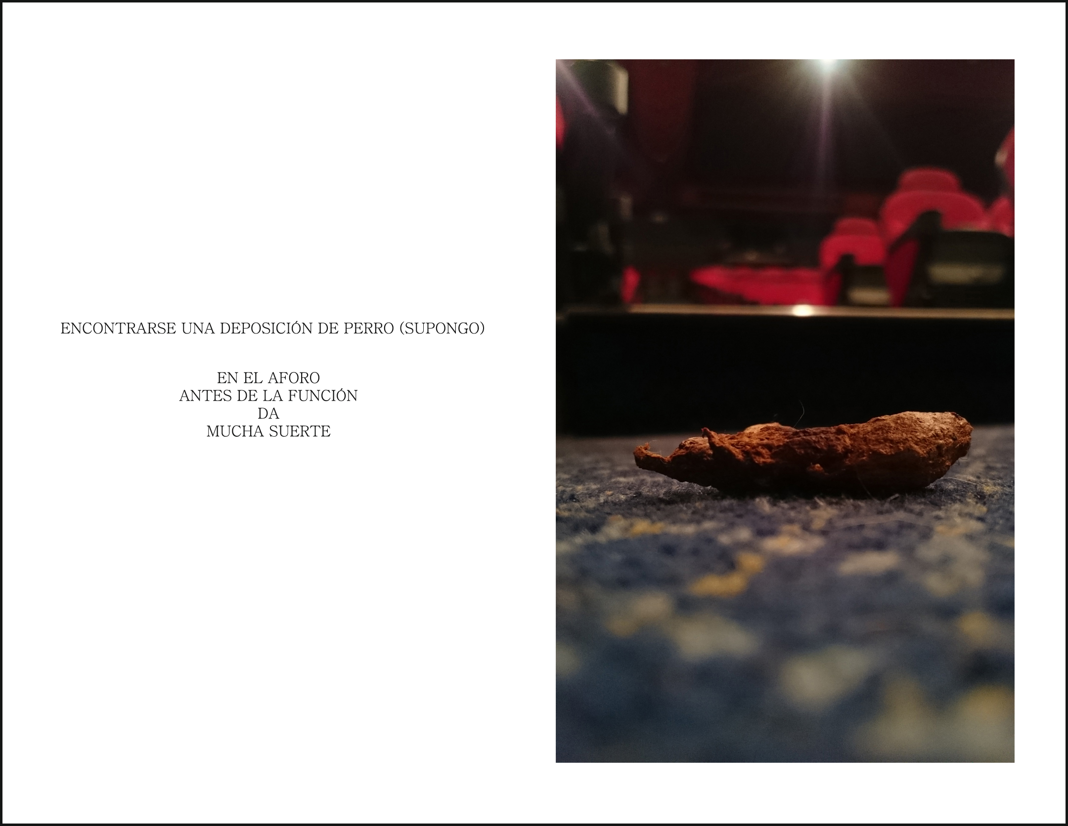09/08/201513/08/2015 | elartecomoherramienta «MUCHA MIERDA». fotografía tomada con el teléfono en un Teatro antes de comenzar la Función. Comparte esto: Compartir en X (Se abre en una ventana nueva) X Comparte en Facebook (Se abre en una ventana nueva) Facebook Me gusta Cargando...