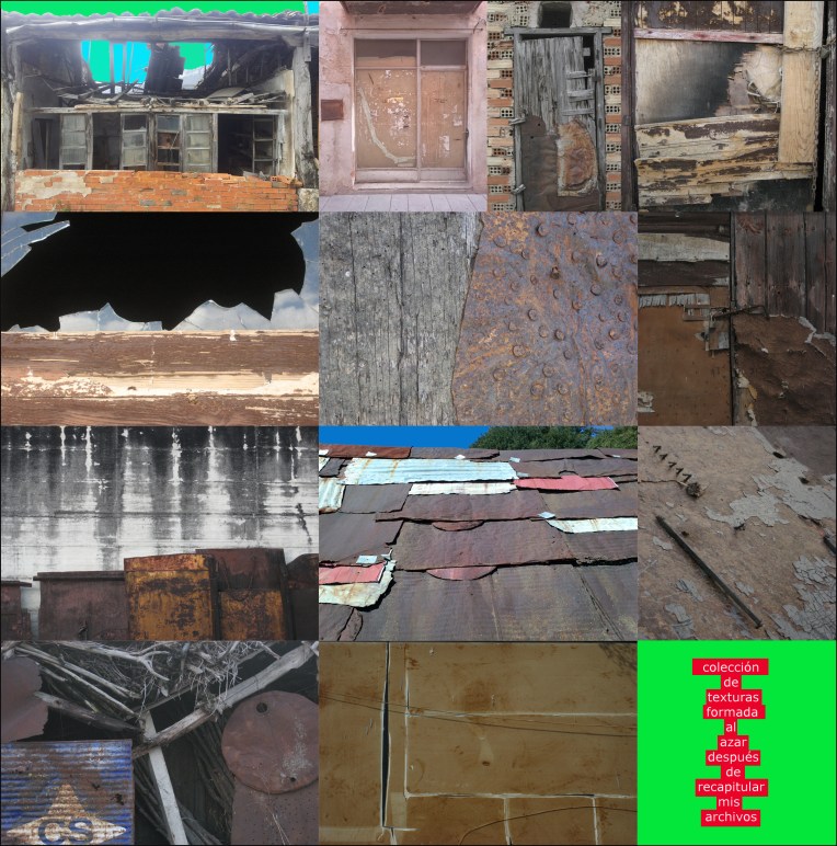 26/01/201826/01/2018 | elartecomoherramienta » COLECCIÓN DE TEXTURAS FORMADA AL AZAR DESPUÉS DE RECAPITULAR MIS ARCHIVOS». conjunto de fotografías y Photoshop. Comparte esto: Haz clic para compartir en X (Se abre en una ventana nueva) X Haz clic para compartir en Facebook (Se abre en una ventana nueva) Facebook Me gusta Cargando...