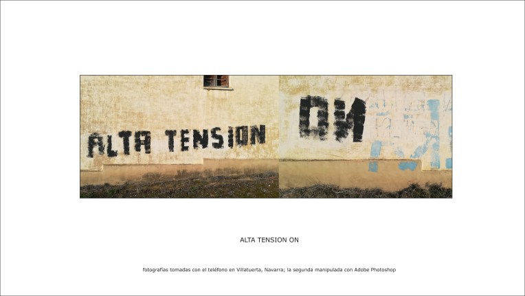 11/01/201912/01/2019 | elartecomoherramienta «ALTA TENSION ON». fotografías tomadas con el teléfono en Villatuerta, Navarra; la segunda manipulada con Adobe Photoshop. Comparte esto: Haz clic para compartir en X (Se abre en una ventana nueva) X Haz clic para compartir en Facebook (Se abre en una ventana nueva) Facebook Me gusta Cargando...