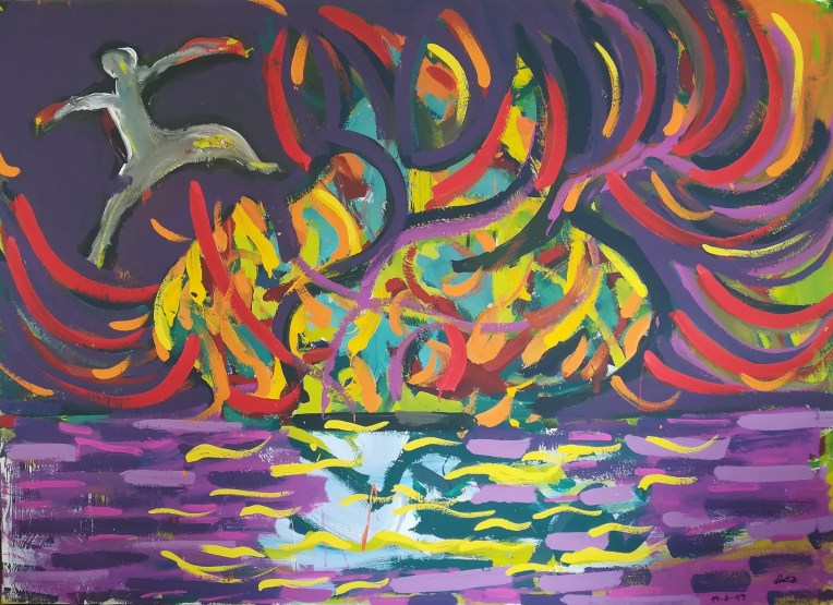 «SANT JOAN». acrílicos sobre lienzo, 163×119 cms. realizado en la grabación de un vídeo promocional de HYBRIDAY, en el estudio de Daniel Trim, en Zaragoza.