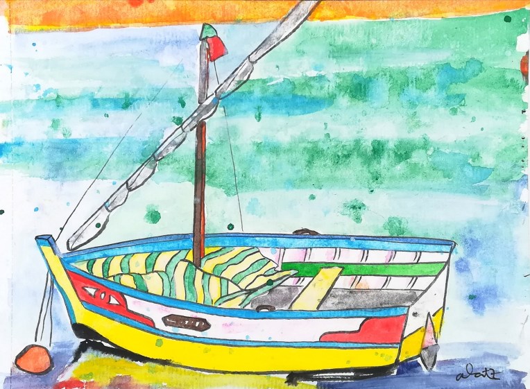 «JOSÉ «DALGADINHO», CONSTRUCTOR DE BARCAS, VILA NOVA DE MILFONTES, ALENTEJO». acuarelas y rotuladores sobre papel. 14×21 cms.