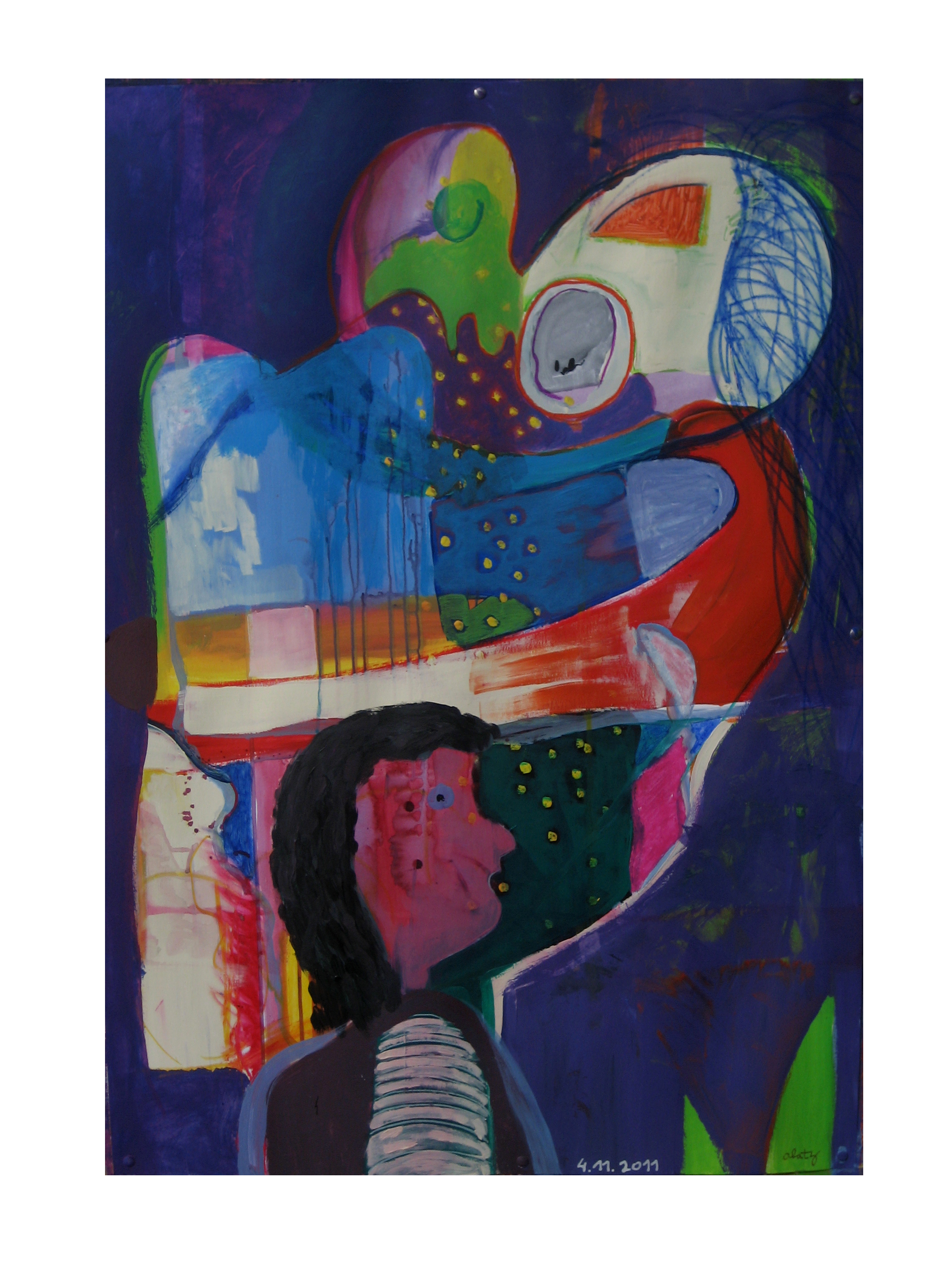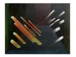 En un principio la intención era realizar un cuadro que fuese una metáfora de cómo entiendo yo el proceso creativo, esto es, una herramienta para observar los cambios que se suceden dentro de mí…de ahí el titulo «espacio interior para observar los cambios de luz». Pero cuando terminé la obra me dí cuenta (el azar está presente) de que los rayos colorados parece que entran y los blancos salen…haciéndome pensar en que el Arte también es una herramienta o espacio para transformar lo que está dentro de mí o lo que entra en mí…para proyectarlo fuera. Convirtiendo el proceso creativo en algo más dinámico…