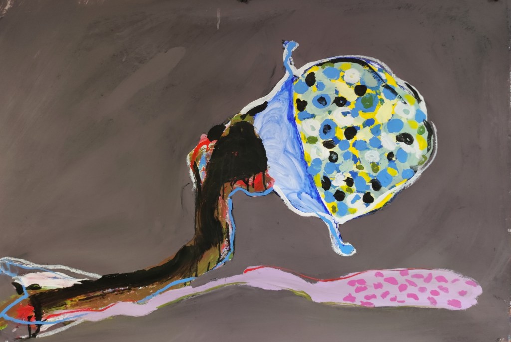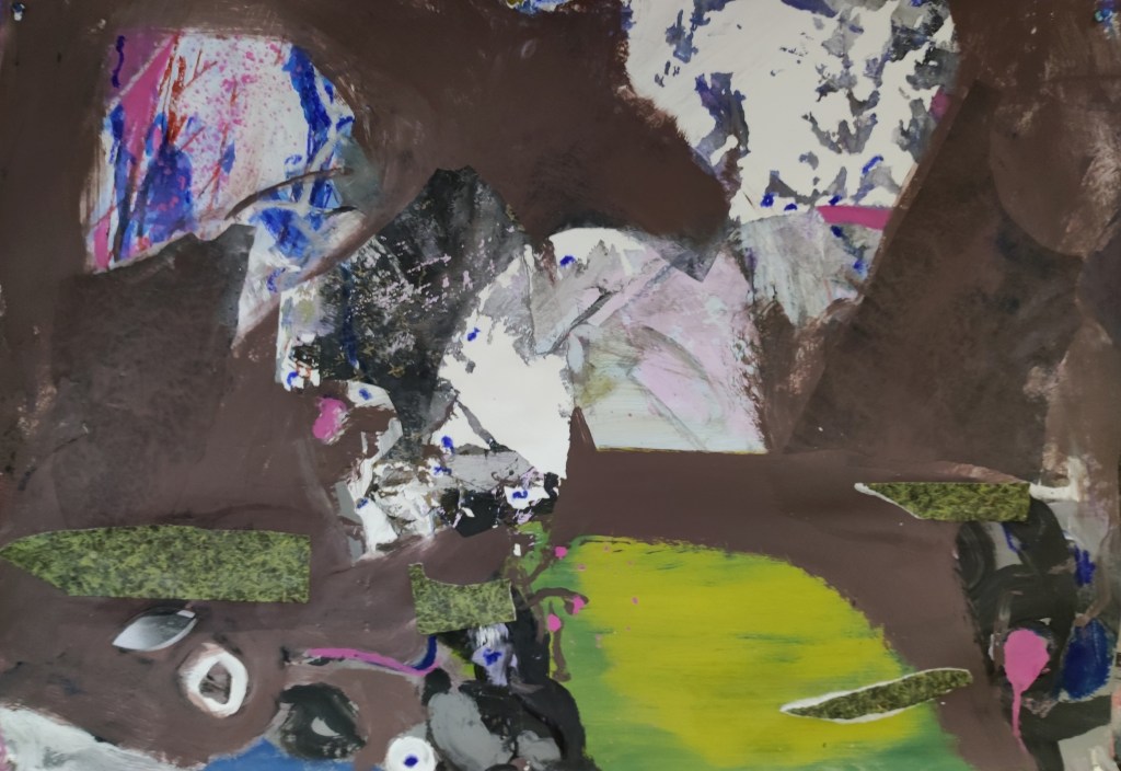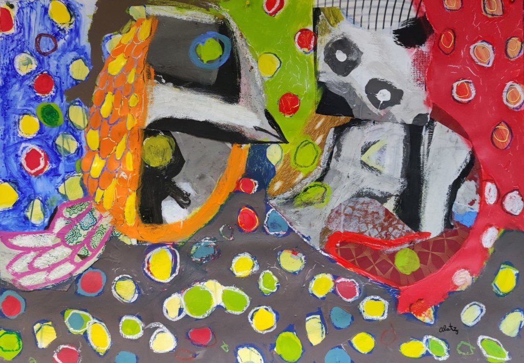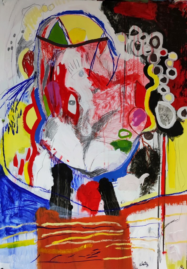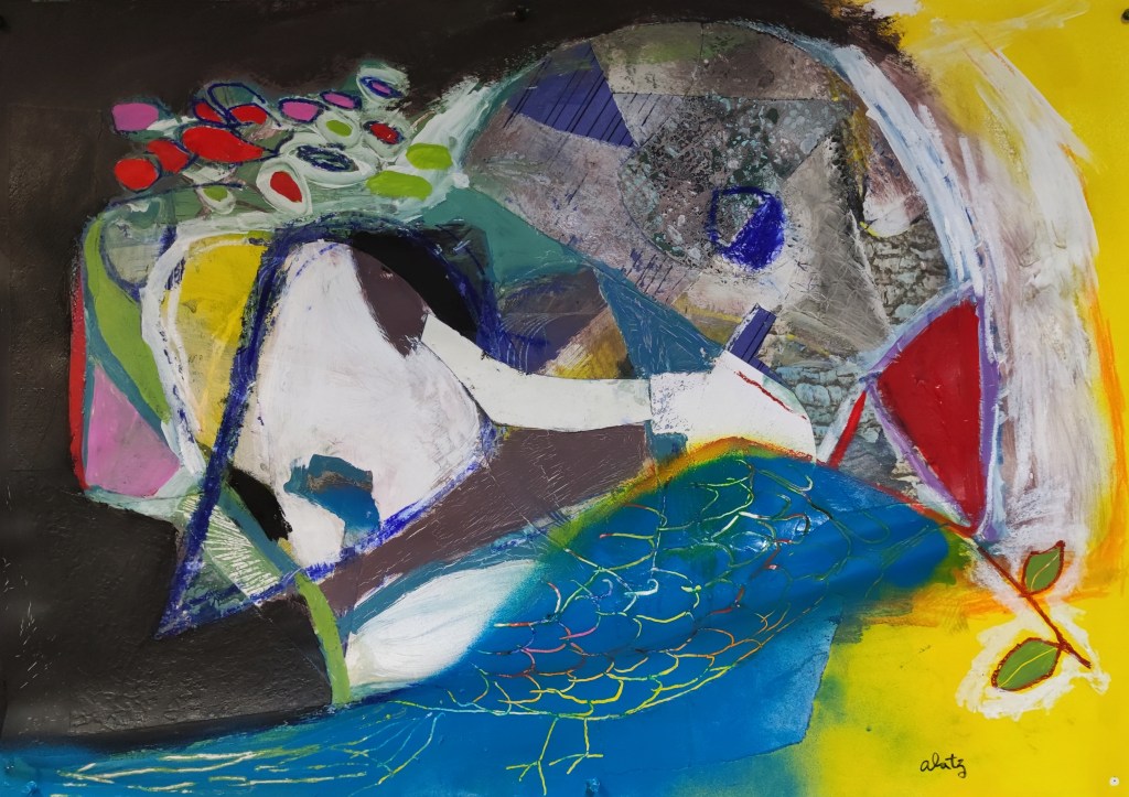 «REGRESA A LA LUZ CON LA CERTEZA QUE EN LA OSCURIDAD TAMBIEN HAY VIDA». ceras, collage, plastidecores, pintura en espray y acrílicos sobre papel. 100×70 CMS.