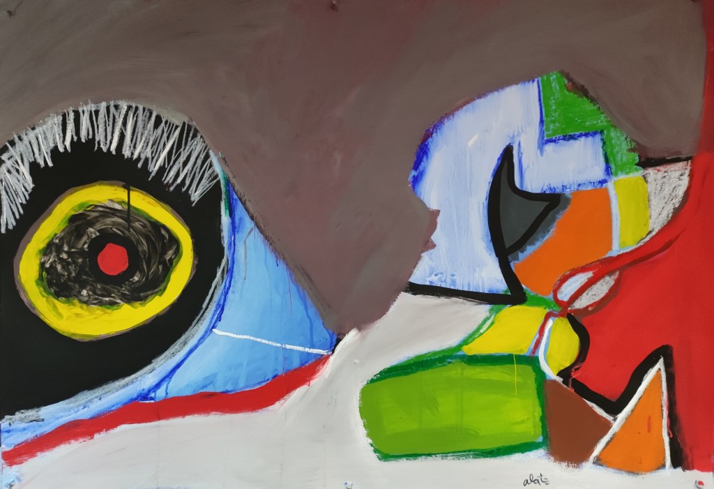 «TOUMAÏ – ESPERANZA DE VIVIR». collage, pintura en espray, acrílicos y ceras sobre lienzo. 142×112 cms.