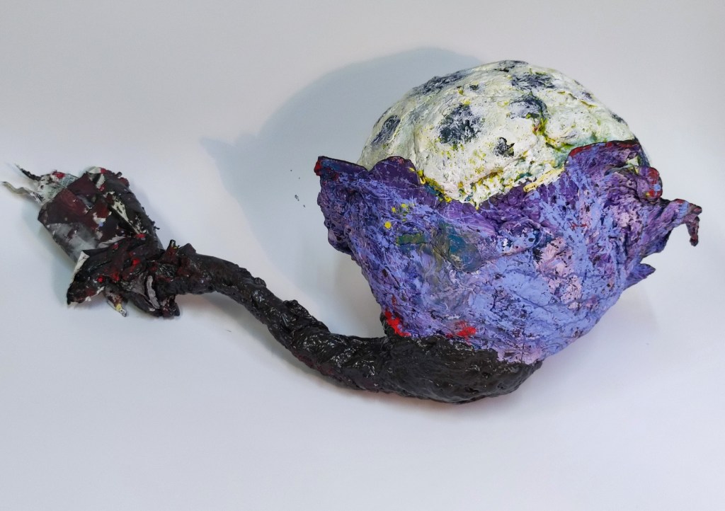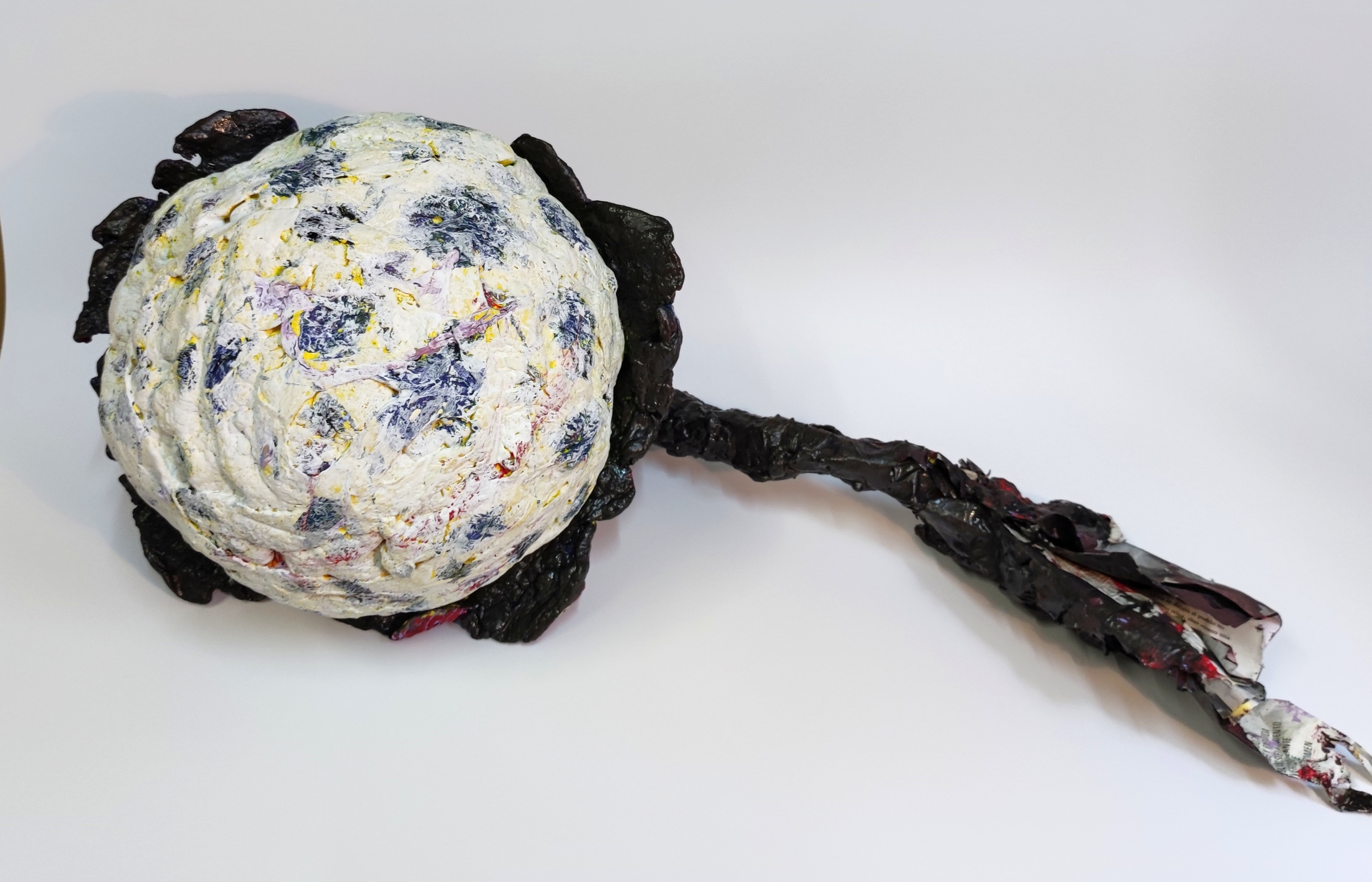 «AZALOREA – COLIFLOR». Escultura realizada con papel de periódico; cinta de carrocero y espuma de poliuretano. Pintada con acrílicos y esmalte. 77x35x30 CMS.